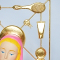 Eléments : vierge marie de récupération non signée en plâtre / cordes à piano / aluminium / résine époxy / acrylique / vernis / feuille d’or.