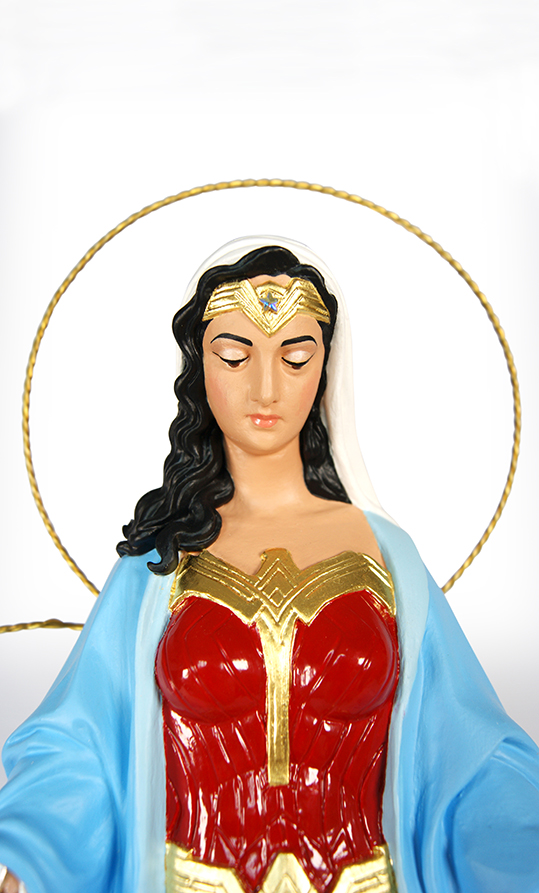 Eléments : Statue de récupération signée BACCI / résine / peinture acrylique / feuille d’or 24 carat / Feuille d’argent pur / tige laiton / strass ancien.